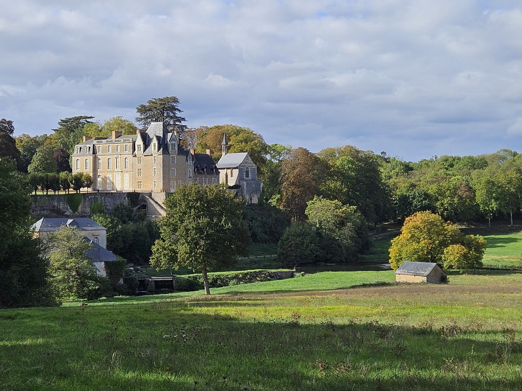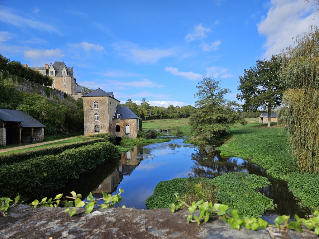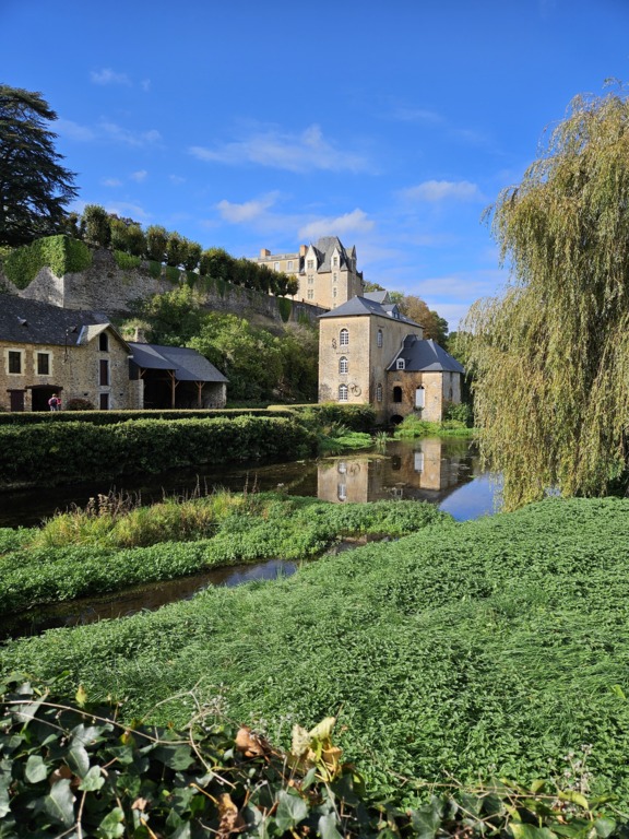 Saulges, village labellisé Petite cité de Caractère est perché sur un éperon rocheux depuis le VIIIe siècle. Nous traversons des sentiers au cœur d’un site Natura 2000. La vallée de l’Erve est un endroit calme et verdoyant où certains s’adonnent à l’escalade.